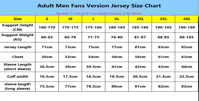 Please note that due to measurement errors. there may be a 1-2 inch discrepancy between the actual jersey size and the size chart. which is considered normal. If your measurements fall between two sizes or if you are overweight or have a muscular build. we highly recommend purchasing a larger size to ensure a more comfortable fit and better wearing experience.