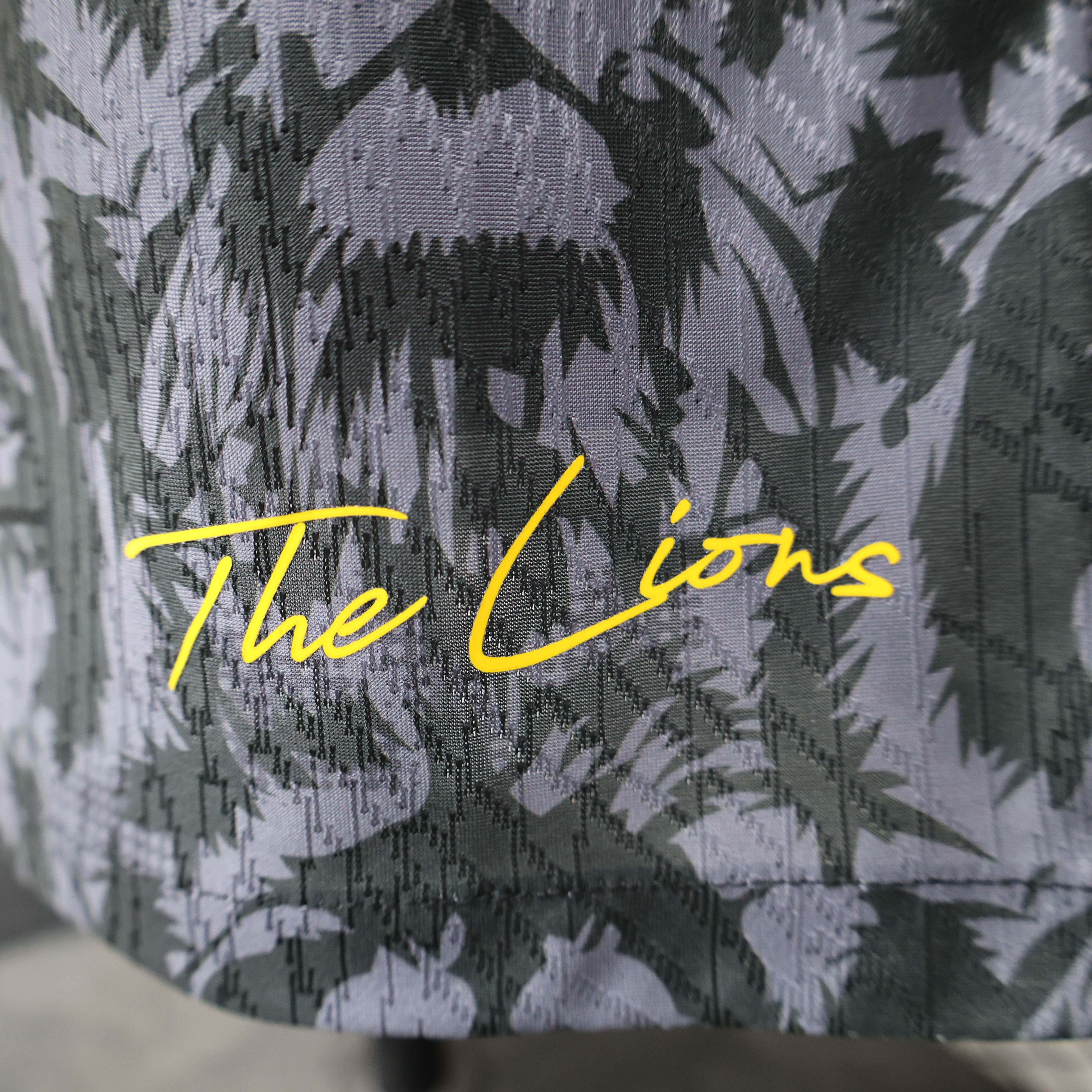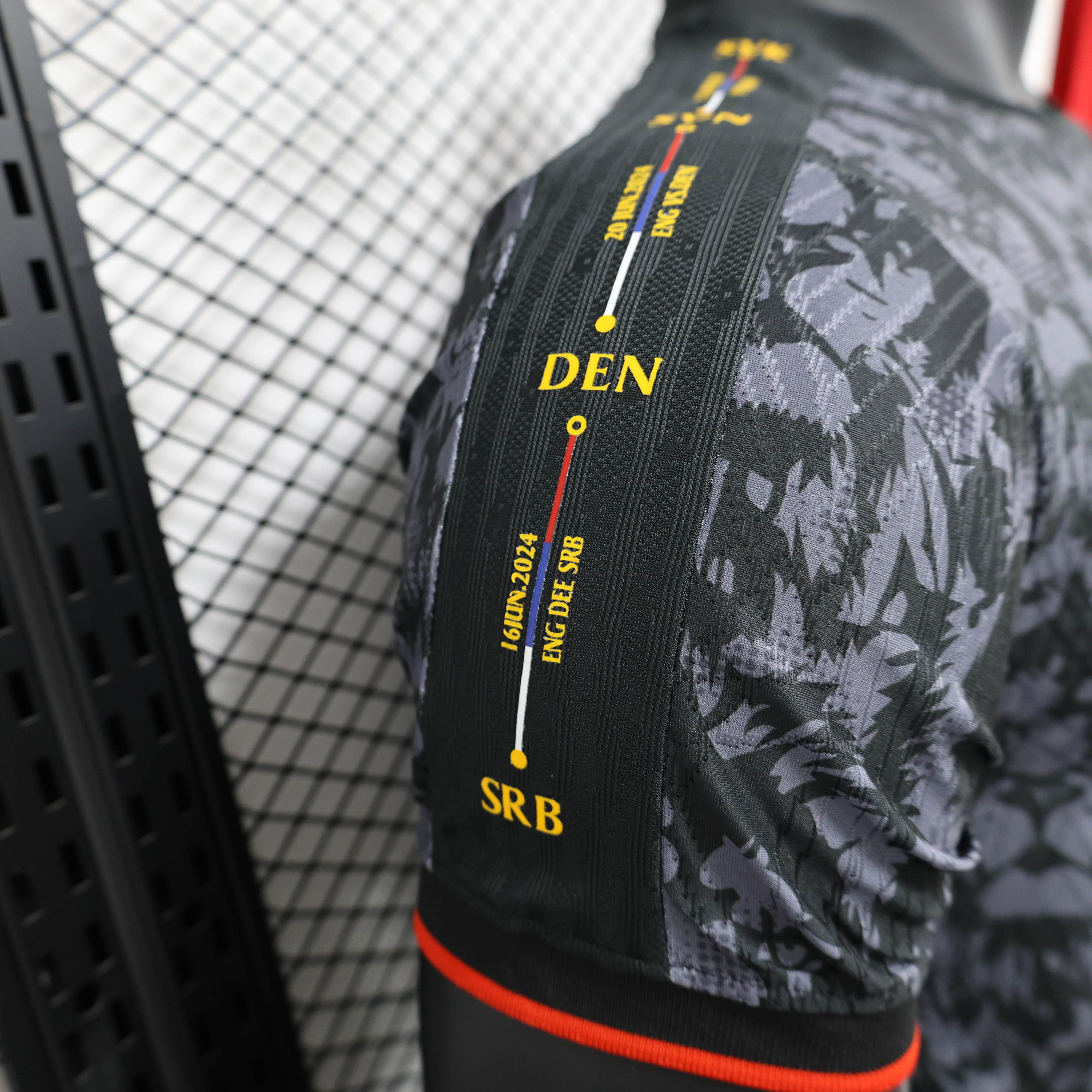 A black jersey with a lion-inspired pattern. Featuring every win of the tournament embroidered along the right and left sleeves. embroidered gold detailing. and back details for their potential first European Championship.